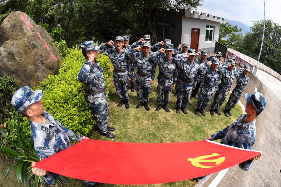 空军某雷达站组织“学战史、话传承”教育活动,官兵们在雷达阵地向党旗宣誓(2018年5月31日摄)。新华社发(潘加胜摄)
