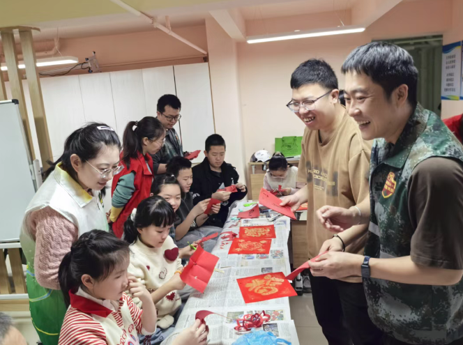 活动现场暖意融融,退役军人志愿者化身“暖心导师”,全程陪伴指导。拓印福字环节,孩子们在志愿者的耐心示范下,亲手印出吉祥红福;剪窗花环节,亲子协作、老兵护航,一张张彩纸变身精美窗花,传递浓浓温情。“我要把亲手做的福字送给爷爷,祝爷爷身体健康,新年快乐!”一名退役军人的孙女手持福字,满脸欢喜地分享心声。“跟着叔叔们学做传统手艺,不仅学会了拓福字、剪窗花,还听他们讲了当兵的故事,特别有意义,我为爸爸曾经是军人感到自豪!”来自现役军人家庭的孩子则说道。