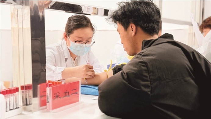 应征青年在工作人员的引导下有序排队、依次候检。采血、身高、体重、心电图、内科、眼科、口腔科、B超、心理测试等11个体检项目依次展开,各区域分工明确、衔接顺畅。