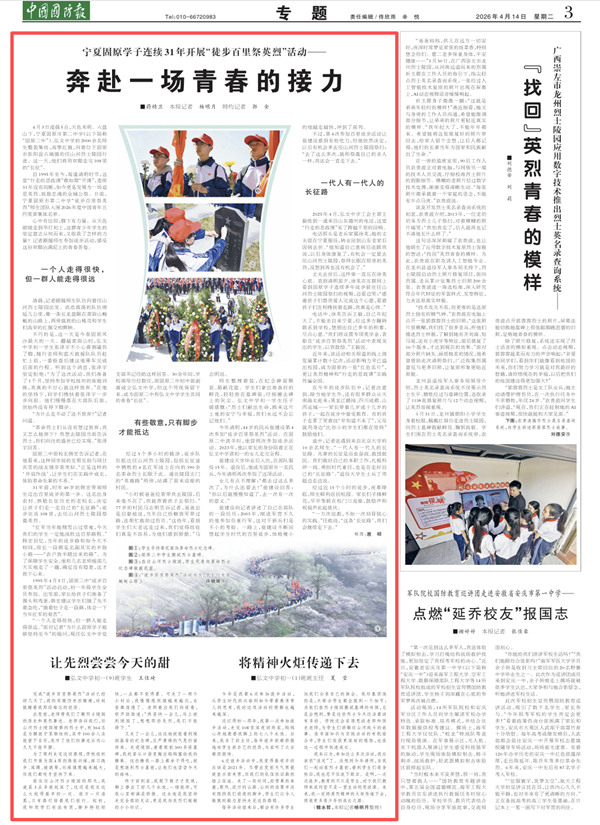 自1995年至今,每逢清明时节,这堂“行走的思政课”都如期“开课”,连续31年没有间断,如今更是发展为一场追思英烈、致敬忠魂的全城公祭。日前,宁夏固原市第二中学“徒步百里祭英烈”师生团队入围2026年度中国青年五四奖章集体名单。