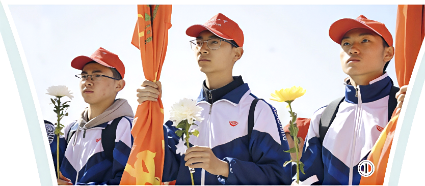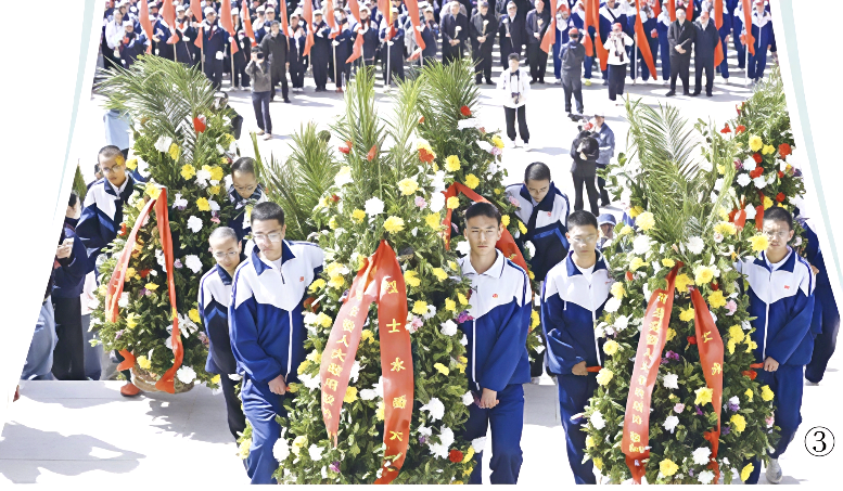 师生整理着装,在纪念碑前默哀、敬献花篮。学生们拿出准备好的鲜花,轻轻放在墓碑前,仔细擦去碑上的灰尘。弘文中学初一学生任子媛感慨:“烈士们献出生命,换来这片土地的安宁与幸福,我们永远不会忘记他们。”
