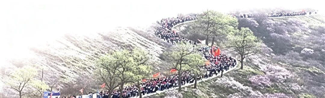 清晨,记者跟随师生队伍向着任山河烈士陵园出发。浩浩荡荡的队伍绵延几公里,像一条长龙盘踞在黄峁山蜿蜒的山路上,两旁盛放的山桃花和学生们高举的红旗交相辉映。