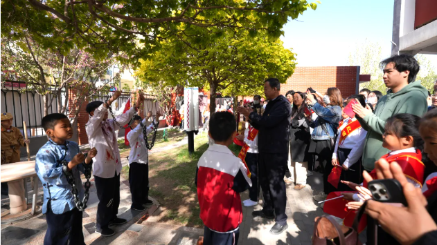 200名学生礼仪生全程参与引导解说,是本次活动的一大亮点。景岳小学提前对礼仪生进行系统培训,涵盖嘉宾引导、点位讲解、礼仪规范等内容,按A、B两条打卡路线分组定岗,让学生在实践服务中近距离传承红色精神,既提升了自身综合素养,也为活动增添了青春底色。
