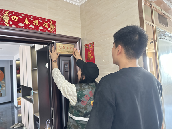 近日,兴庆区银古路街道云和社区退役军人服务站工作人员为退伍归乡的退役军人家庭悬挂“光荣之家”牌匾,切实将党和政府的关怀传递至退役军人及军属心中,营造全社会尊崇军人的浓厚氛围。