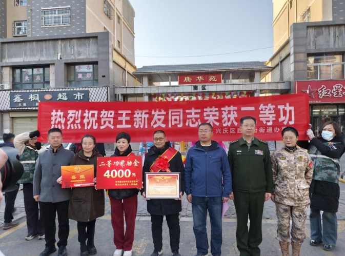 锣鼓铿锵,捷报传家。送喜报队伍身着正装,高擎“热烈祝贺王新发同志荣获二等功”的红色横幅,在喧天锣鼓和邻里掌声中,踏着新春喜气步入立功军人家中。街道武装部负责人现场宣读立功喜报,部队相关负责人详细介绍了王新扎根军营、精武强能、履职尽责、圆满完成各项任务的突出事迹,字里行间彰显军人铁肩担当。兴庆区人武部上校政委郭新平对军人矢志强军、建功军营的奋进姿态给予高度评价,向默默支持国防事业的军属致以新春问候与崇高敬意;兴庆区退役军人事务局主要负责人宣读慰问信,向军人家庭传递组织关怀与节日祝福。