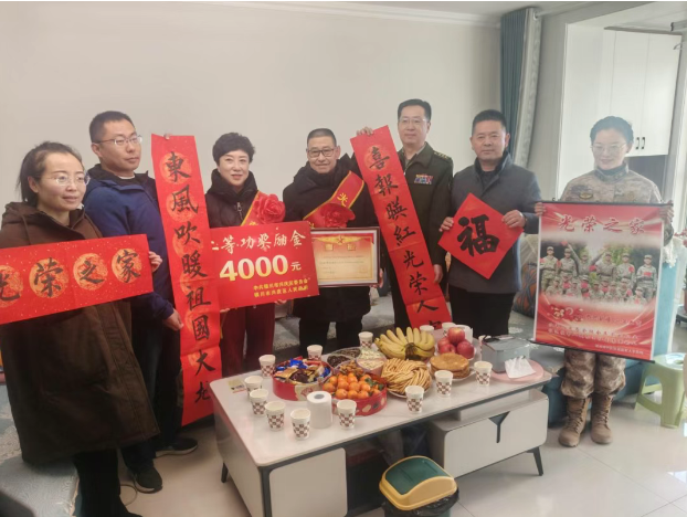 现场,工作人员为军属披挂荣誉绶带、佩戴吉祥红花,将红彤彤的二等功喜报与慰问金送到家人手中。邻里乡亲纷纷驻足围观、鼓掌喝彩,共同见证这一属于军人、家庭与社区的荣耀时刻,整条街巷洋溢着尊崇与喜悦。军属手捧喜报,难掩激动之情,感谢部队的培养和地方党委、政府的关怀,表示将继续当好坚强后盾,鼓励子女珍惜荣誉、再立新功,不负家乡人民期望,以更优异成绩为新春添彩、为军旗增辉。