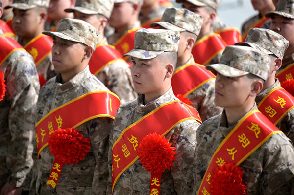 戎装在身,红花在胸,新兵们队列严整。记者 王鼎 马赛尔 摄