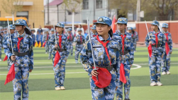 揭牌结束后核心成果展演惊艳登场,海军特色融合方阵将刺杀操与旗语操结合,刚劲凌厉的动作尽显少年铁血,规范的旗语传递深蓝使命,一动一静间,尽显小海军的飒爽英姿,赢得全场阵阵喝彩。随后,大刀队、旗语操、军体拳方阵依次登场,拳拳生风、身姿矫健,将少年精气神展现得淋漓尽致,现场掌声不断。