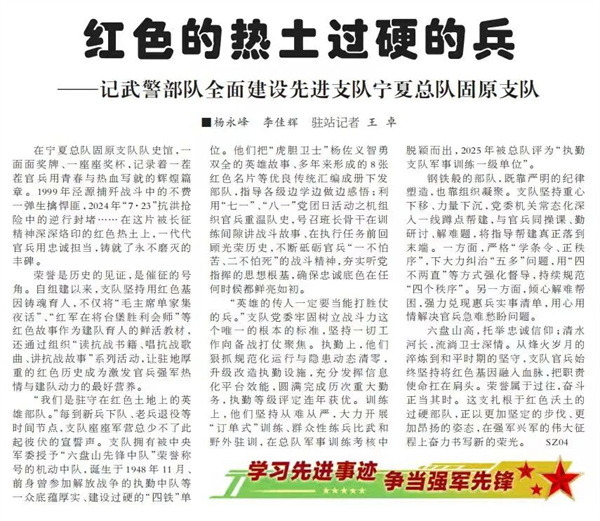 六盘山高,托举忠诚信仰;清水河长,流淌卫士深情。从烽火岁月的淬炼到和平时期的坚守,支队官兵始终坚持将红色基因融入血脉,把职责使命扛在肩头。荣誉属于过往,奋斗正当其时。这支扎根于红色沃土的过硬部队,正以更加坚定的步伐、更加昂扬的姿态,在强军兴军的伟大征程上奋力书写新的荣光。
