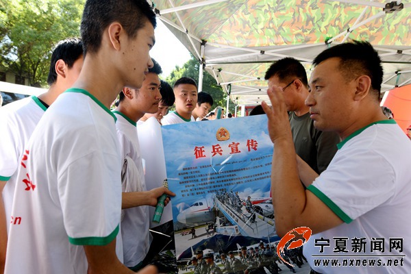 7月18日,炎炎烈日,在中卫市红太阳广场,人武部工作人员正在向市民介绍参军入伍相关政策。当日,中卫市沙坡头区人民武装部开展了以“参军尽义务 戍边为国防”为主题的征兵宣传活动。据悉,截至目前,沙坡头区网上报名1010人,大学生216人;到各乡镇实际报名参军人数416人,已经达到并超过应征对象上站体检数量与年度征集数量3:1的要求。 宁夏新闻网记者 祁瀛涛 摄