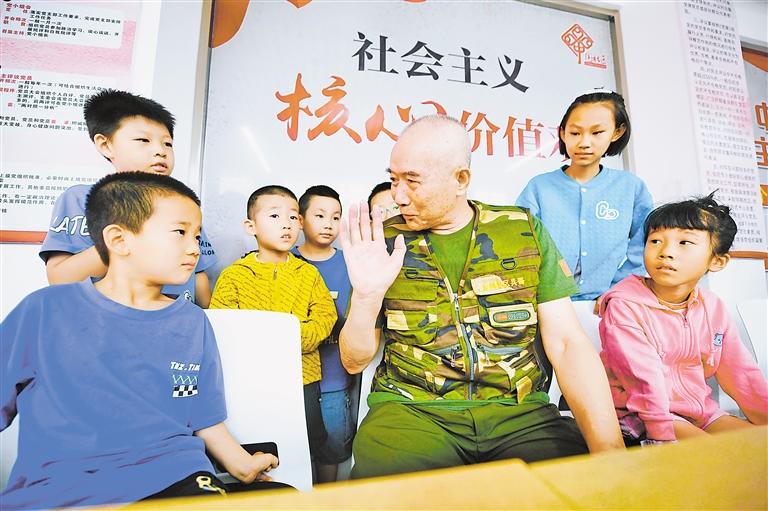 7月29日,71岁的退伍老兵吕玉才给孩子们讲述自己从军的故事。当日,银川市兴庆区银古路云和社区邀请辖区内退役军人与青少年一同开展“传承红色基因,铸就红色信仰”——迎八一建军节主题活动,退役老兵和社区居民欢聚一堂,共同庆祝中国人民解放军建军97周年。记者 马楠 摄